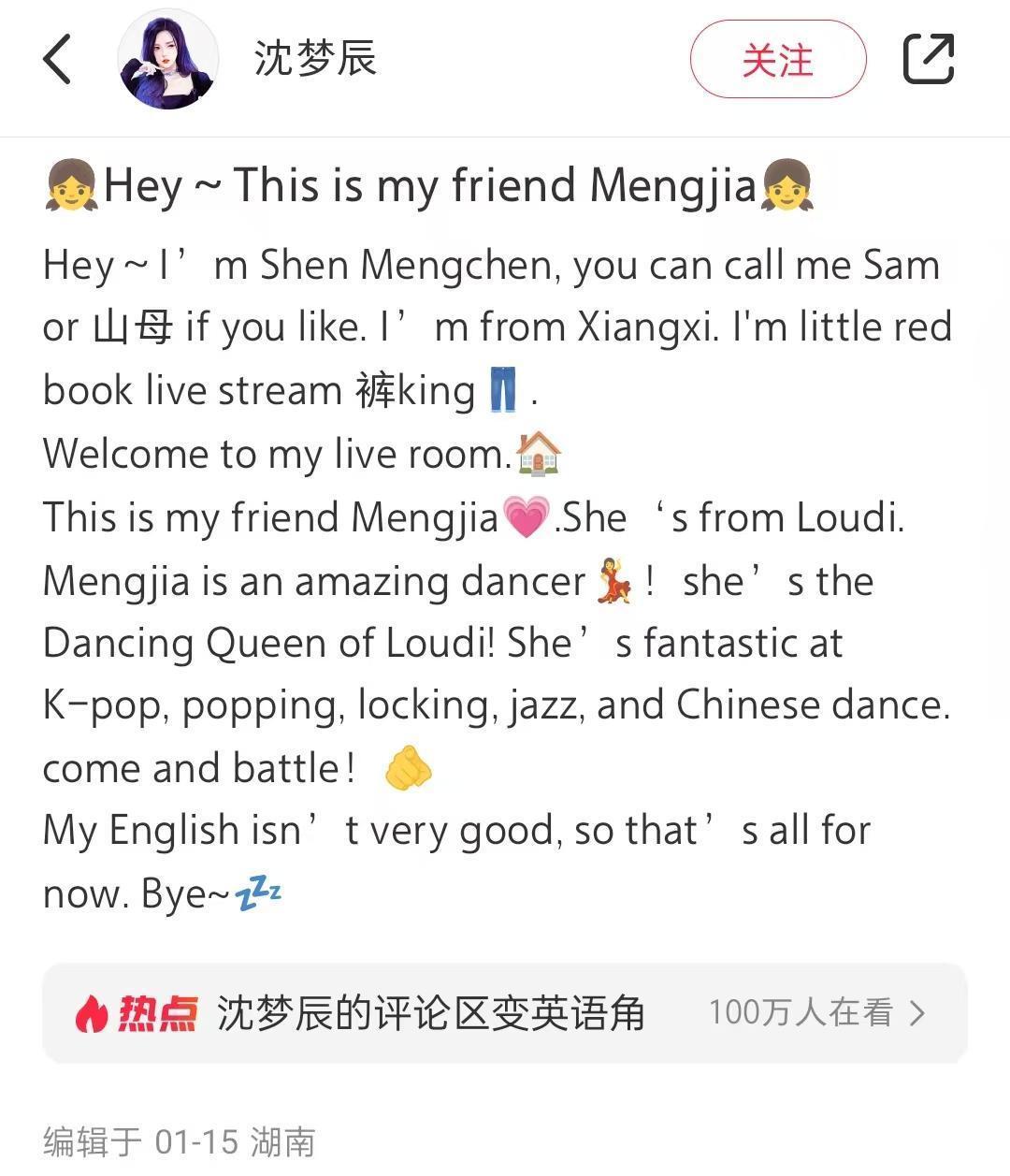 沈梦辰先用英文介绍了自己的职业及家乡,又用英文向外国人介绍好友孟佳,表示她是很厉害的舞者,并晒出了两人的合照。