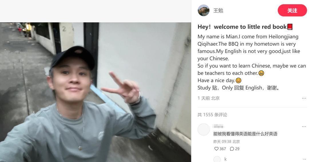 王勉用着简单的英文词汇介绍了自己,并表示如果对方想学中文可以互相教学,结尾还用了中式英文“study 贴”等,很有梗。
