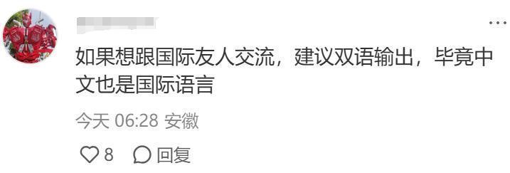 英语仍然是中外交流的重要语言,为了能更好的沟通,外国人使用翻译器等方式发中文,还表态要努力学普通话,而中国网友也很积极地使用中英双语,方便外国友人阅读。